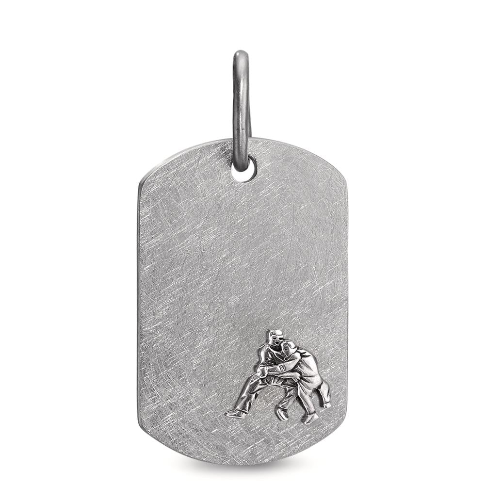 Stoere heren gravurehanger van hoogwaardig roestvrij staal met een zilverkleurige finish. De hanger heeft een uniek design met een reliëf van schimmende mannen, wat kracht en sportiviteit uitstraalt. Perfect voor persoonlijke gravure en als cadeau.