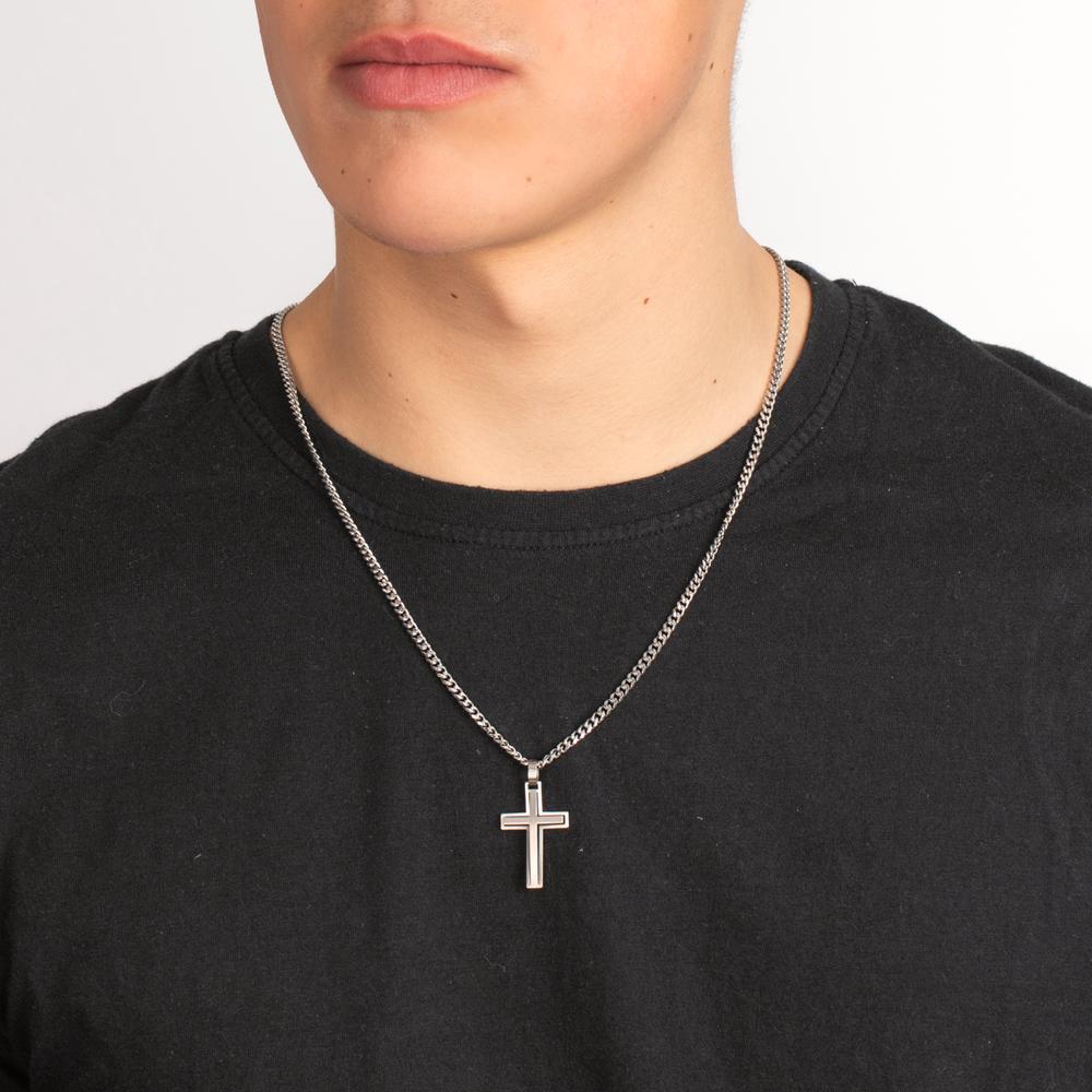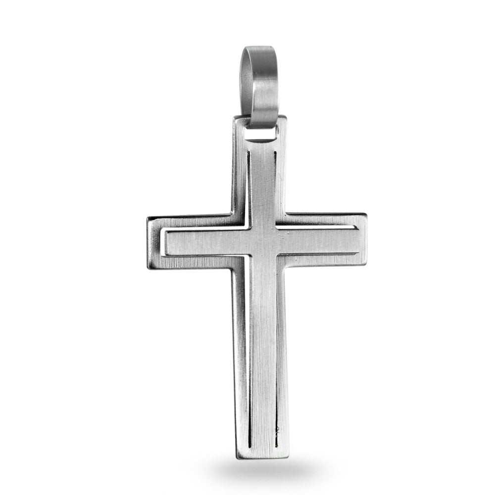 Stijlvolle heren hanger van roestvrij staal in kruisvorm. Dit duurzame en tijdloze sieraad is perfect voor dagelijks gebruik en voegt een symbolische touch toe aan elke outfit. Een prachtig en eenvoudig ontwerp dat bij elke gelegenheid gedragen kan worden.