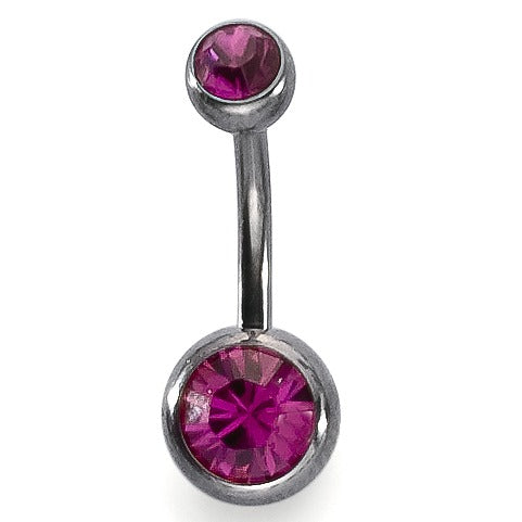 Stijlvolle dames buikpiercing van titanium met twee fonkelende paarse kristallen. Lichtgewicht, huidvriendelijk en ideaal voor dagelijks gebruik. Elegante uitstraling die je look subtiel accentueert. Perfect voor wie durft te stralen met een trendy accessoire.