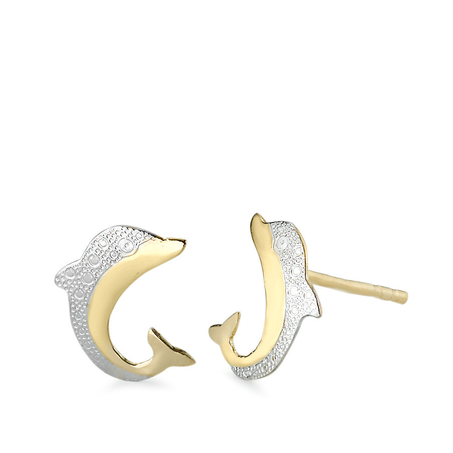 Schattige meisjesoorstekers van 375 geelgoud in de vorm van een dolfijn. Het speelse ontwerp met witte accenten maakt deze oorstekers perfect voor dagelijks gebruik en speciale gelegenheden. Licht, comfortabel en een prachtig cadeau voor jonge meisjes.