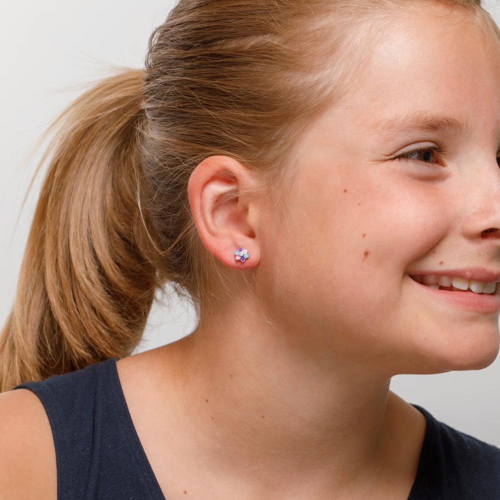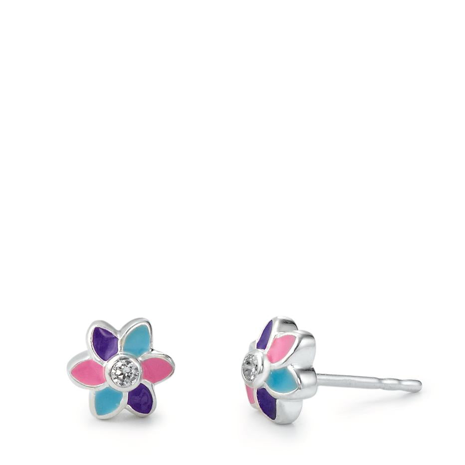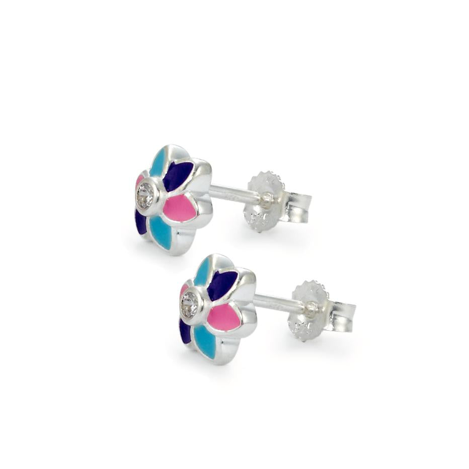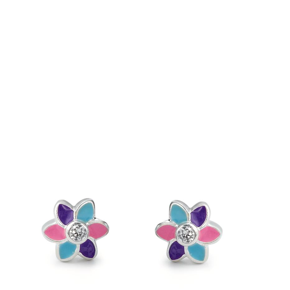 Schattige oorknopjes voor meisjes van zilver in bloemvorm. De blaadjes zijn kleurrijk dankzij roze, blauw en paars emaille. In het midden schittert een fonkelende zirkonia. Perfect voor dagelijks dragen en als lief cadeau. Lichtgewicht en huidvriendelijk design.
