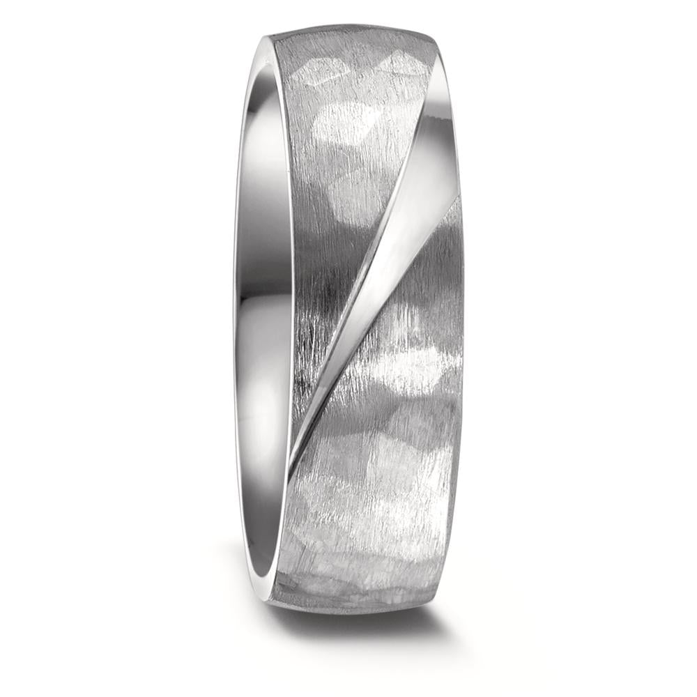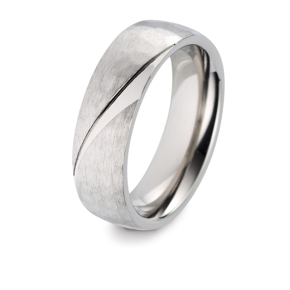 Stijlvolle partnerring gemaakt van duurzaam titanium. De ring combineert een matte, gestructureerde afwerking met een glanzend, gebogen detail voor een moderne uitstraling. Licht en stevig, perfect voor dagelijks gebruik en een symbool van uw verbondenheid.