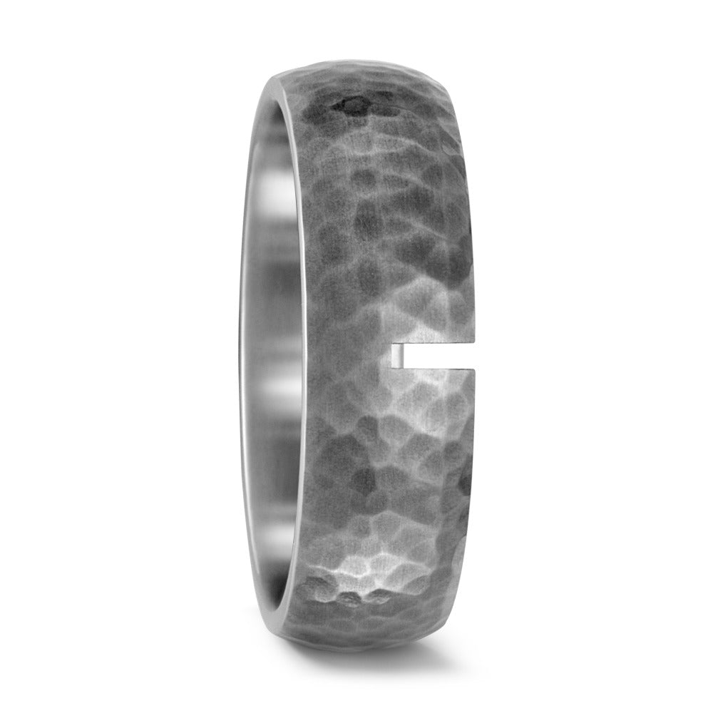 Stoere partnerring gemaakt van duurzaam titanium met een unieke hamerslagtextuur. De ring heeft een matte afwerking en een modern ontwerp met een subtiele inkeping, ideaal voor koppels die houden van een eigentijdse en robuuste stijl. Licht en huidvriendelijk.