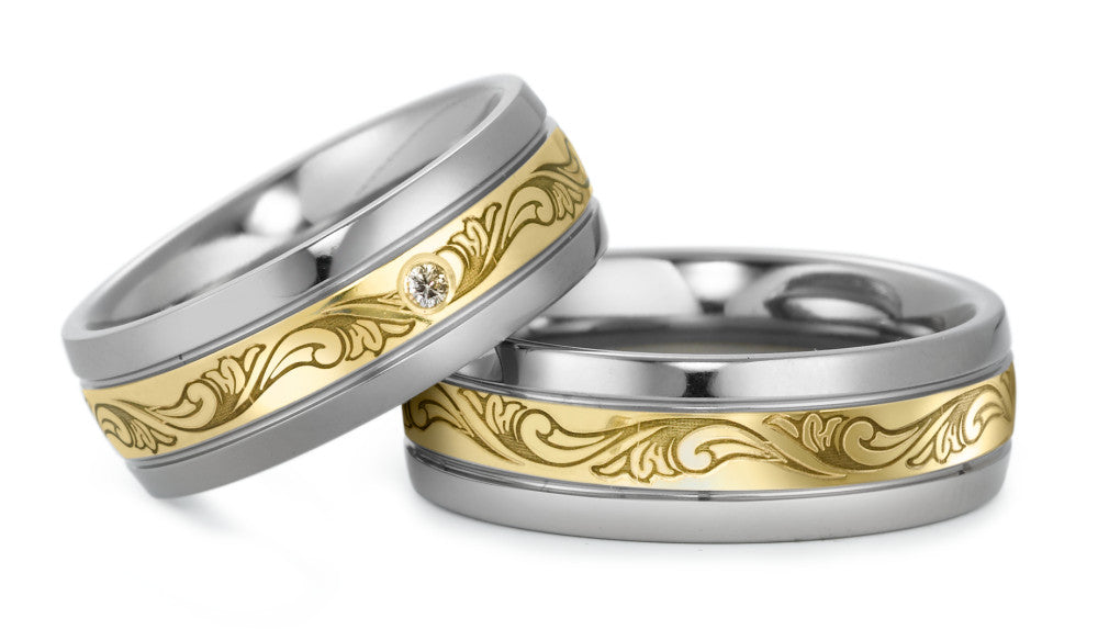 Stijlvolle dames partnerring van duurzaam titanium met een elegante band van 750 geelgoud, versierd met een schitterende diamant. Het unieke, sierlijke motief op het goud benadrukt de verfijnde uitstraling van deze ring. Perfect als symbool voor verbondenheid en liefde.