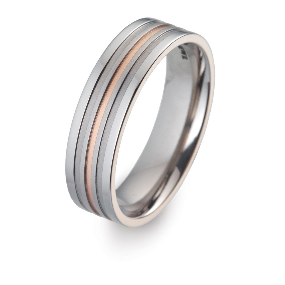 Stoere partnerring van duurzaam titanium met een stijlvolle 750 roségouden baan in het midden. Deze ring combineert moderne kracht met tijdloze elegantie, perfect voor stellen die een unieke en degelijke symboliek zoeken. Comfortabel en krasbestendig design.