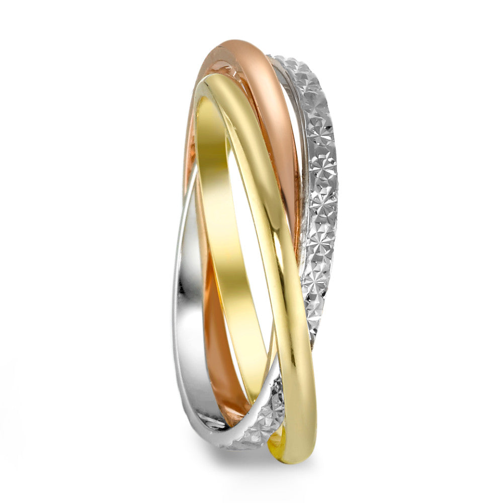Stijlvolle damesring van 375 geelgoud met drie verschillende gekleurde banden: geel, rosé en wit goud. Het verfijnde design combineert gladde en gestructureerde elementen voor een tijdloze en elegante uitstraling. Perfect voor dagelijks draagcomfort en speciale gelegenheden.
