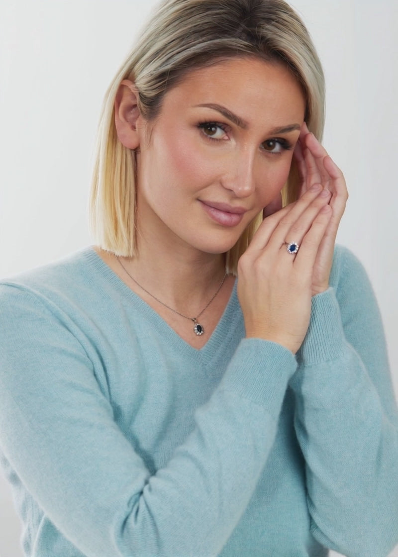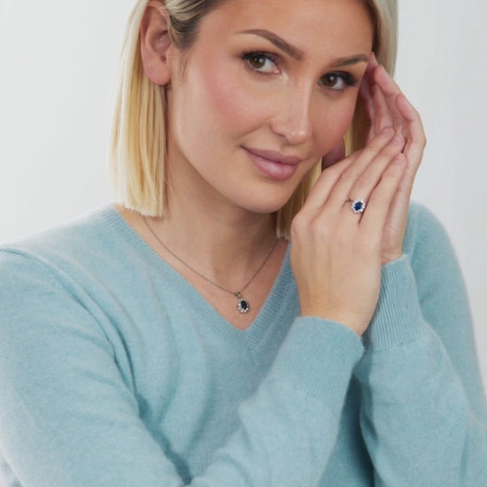 Elegante damesring gemaakt van 18 karaat witgoud, versierd met een schitterende ovale saffier en omlijst door fonkelende diamanten. Dit verfijnde sieraad combineert tijdloze schoonheid met een luxe uitstraling, perfect voor speciale gelegenheden of als waardevol cadeau.