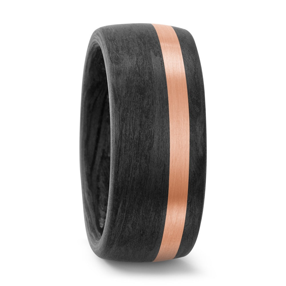 Deze damesring combineert het sterke, lichte carbon met elegant 750 roodgoud. Het design is modern en tijdloos, perfect voor een verfijnde look. Door het unieke materiaalcontrast valt deze ring op en is hij een stijlvolle toevoeging aan elke outfit.