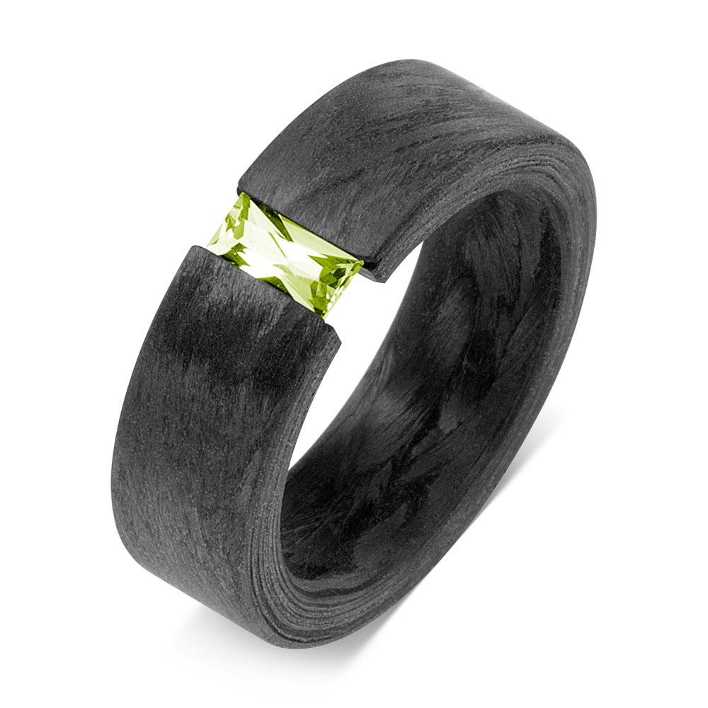 Stijlvolle damesring van hoogwaardig carbon met een frisse peridot edelsteen in het midden. Modern en lichtgewicht design voor dagelijks draagcomfort. Een uniek sieraad dat elegantie en duurzaamheid combineert. Perfect als cadeau of om jezelf te verwennen.