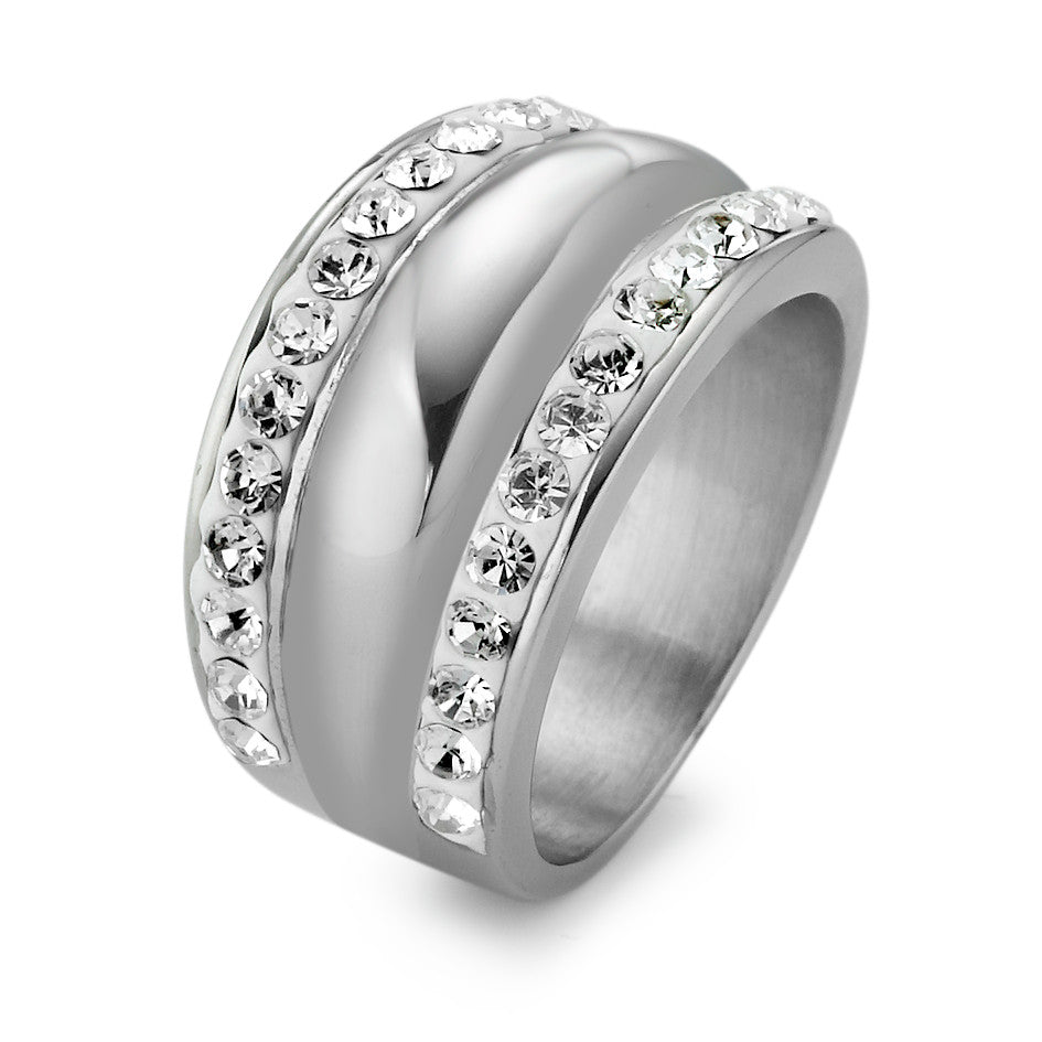 Elegante damesring gemaakt van hoogwaardig roestvrij staal. De ring is versierd met schitterende kristallen aan beide kanten, wat zorgt voor een luxueuze uitstraling. Perfect voor elke gelegenheid en combineert stijl met duurzaamheid en comfort.