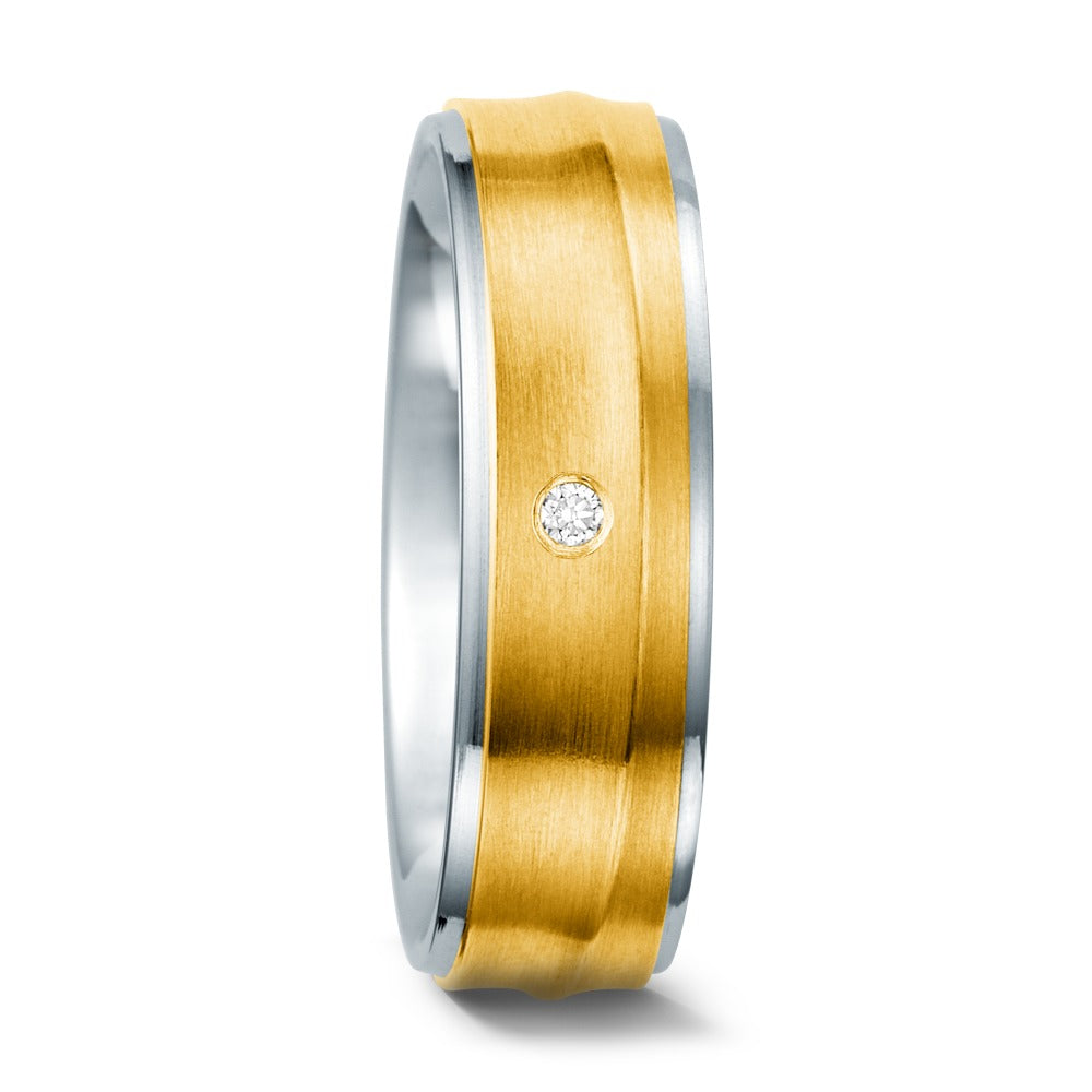 Stijlvolle damesring van hoogwaardig roestvrij staal met een elegante middenband van 750 geelgoud. De ring is versierd met een fonkelende diamant, perfect voor dagelijks draagplezier en speciale gelegenheden. Tijdloos design dat luxe en duurzaamheid combineert.