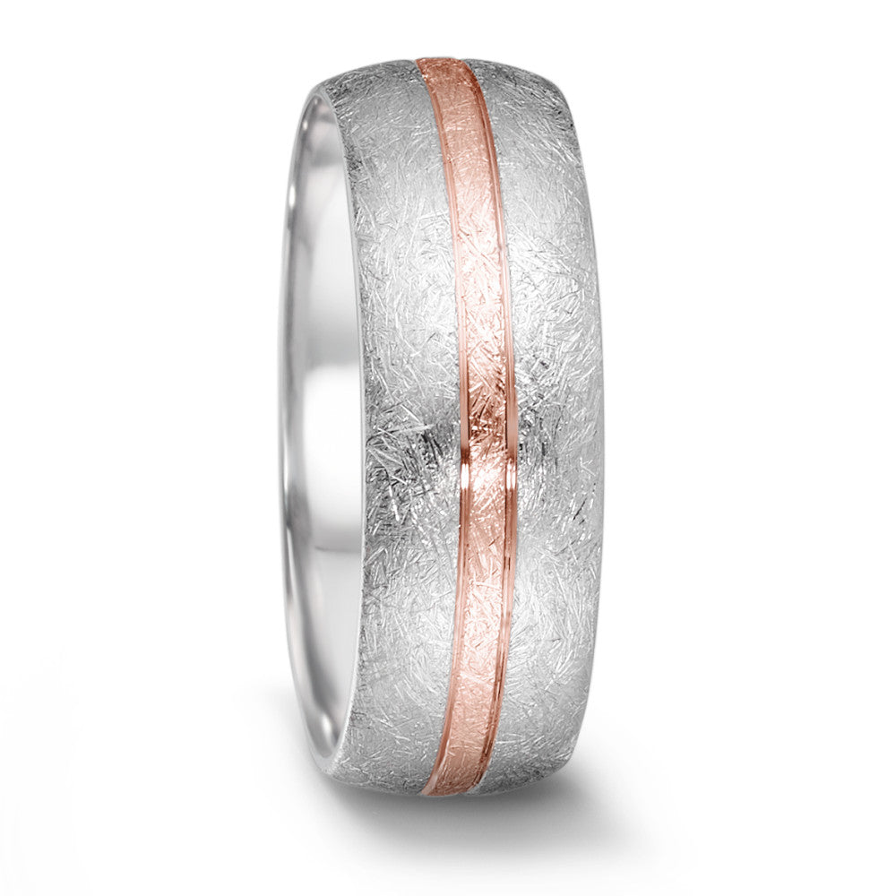 Stijlvolle en moderne ring van hoogwaardig roestvrij staal met een elegante strook 750 roségoud in het midden. De geborstelde afwerking geeft de ring een unieke en verfijnde uitstraling. Perfect voor dagelijks gebruik of als bijzonder geschenk. Duurzaam en tijdloos design.