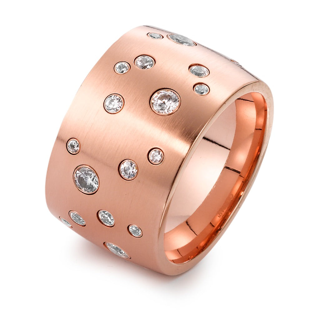 Stijlvolle damesring van roestvrij staal met een brede band in roségoud. De ring is versierd met fonkelende zirkonia-steentjes, die zorgen voor een sprankelend effect. Perfect voor elke gelegenheid en een elegante toevoeging aan iedere sieradencollectie.